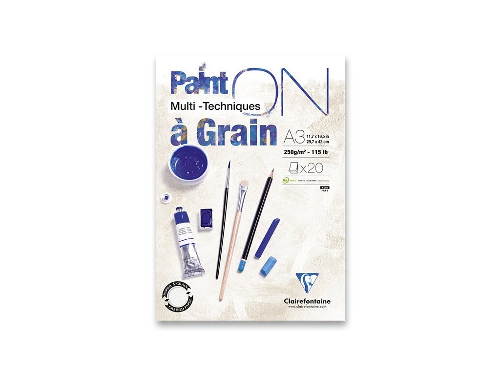 Blok Clairefontaine Paint on Grain má extra bílý papír ze 100% celulózy s odlišnými povrchy z každé strany. Na straně jedné je papír výrazně hrubší a na straně druhé je hladký. Papíry jsou vhodné pro suchou i mokrou techniku a mají dobré absorpční schopnosti. Obsahuje 20 listů a má gramáž 250 g/m2. Tento víceúčelový papír je možné použít na techniky: tužka, inkoustové pero, technické pero, kvaš, temperu, akryl, inkoust, akvarel, křídu, uhel, pastel, fix. Blok je lepený po kratší straně.